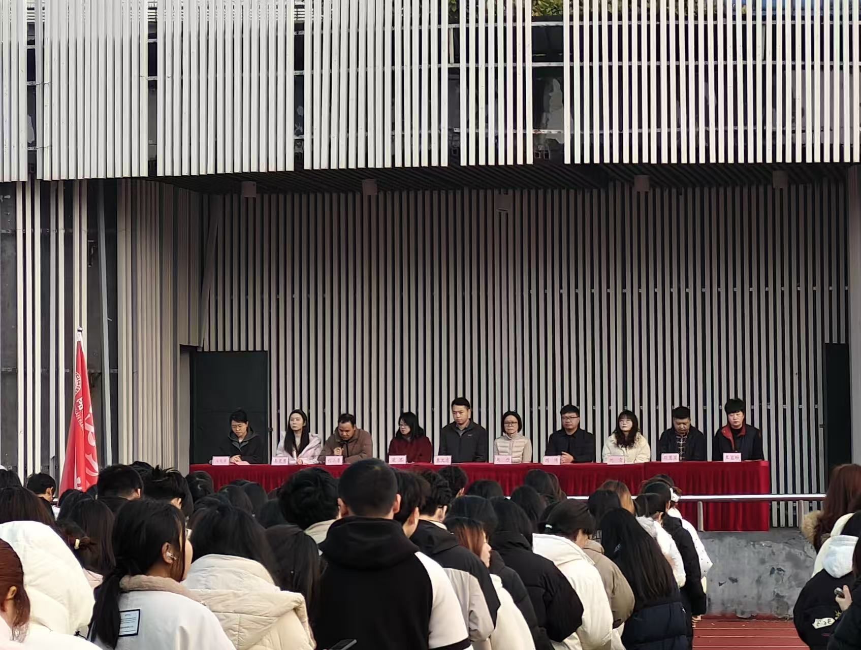 仪式上各⼆级学院通报近期学⽣违规违纪情况及处分决定,明确考⻛考纪与校园纪律是不可触碰的红线,考试舞弊等⾏为严重违背学术诚信与公平原则,学校将依规严肃处理,引导全体同学引以为戒,⾃觉维护优良学⻛。